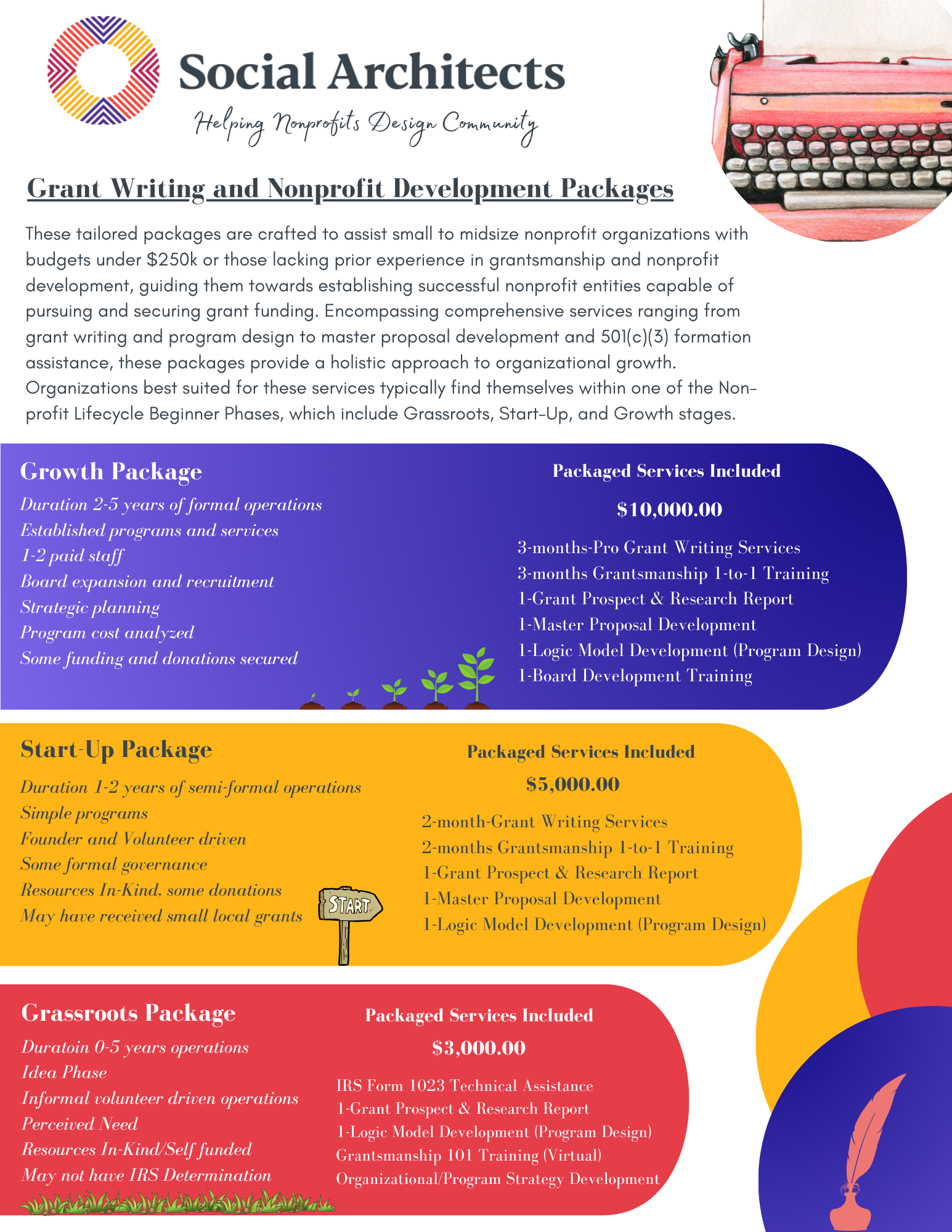 Each package provides a structured, strategic path toward strengthening your nonprofit's infrastructure and funding capacity. Let Social Architects LLC help you design a pathway to long-term sustainability—reach out to explore which package best fits your organization’s needs.