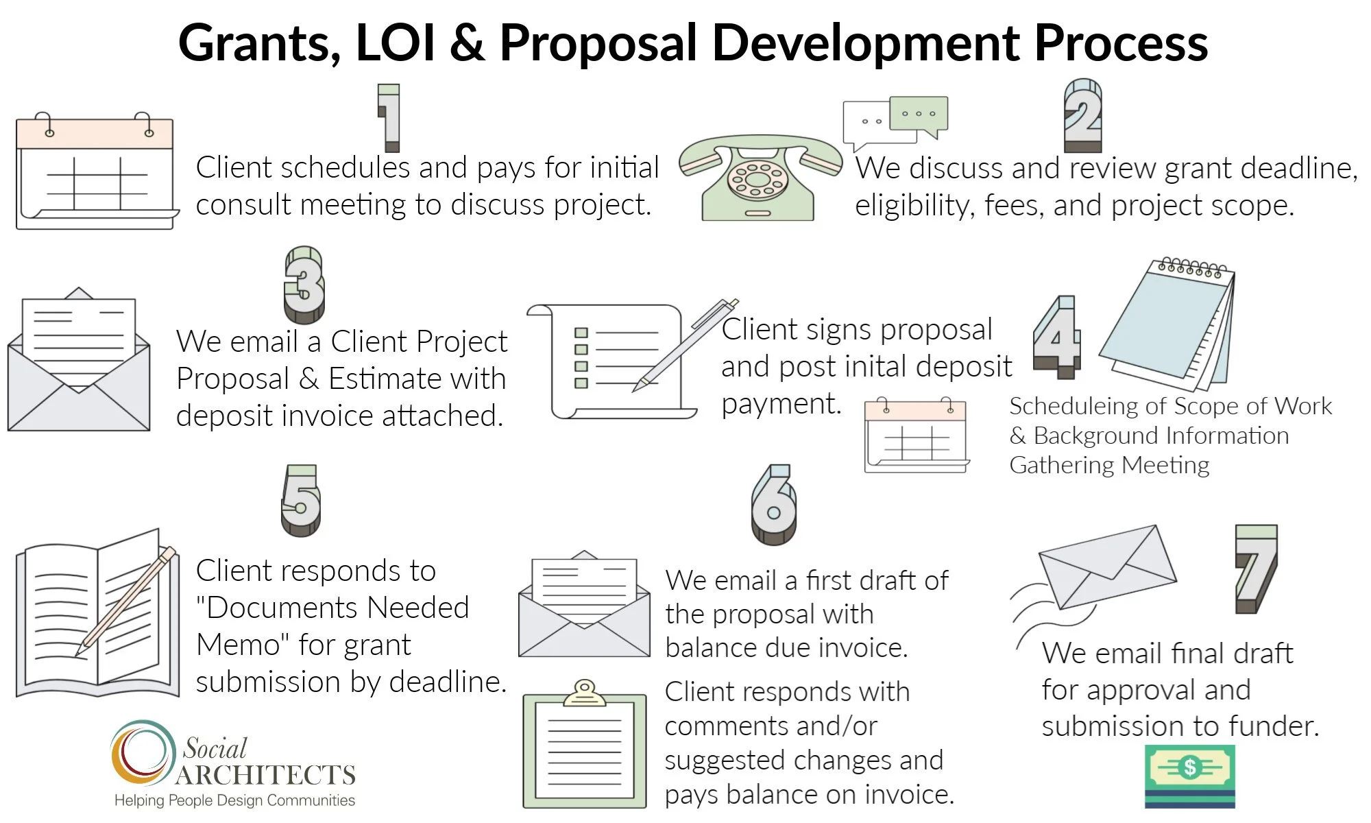 The client and consultant review the grant opportunity, including deadline, eligibility, fees, and project scope.Proposal & Estimate