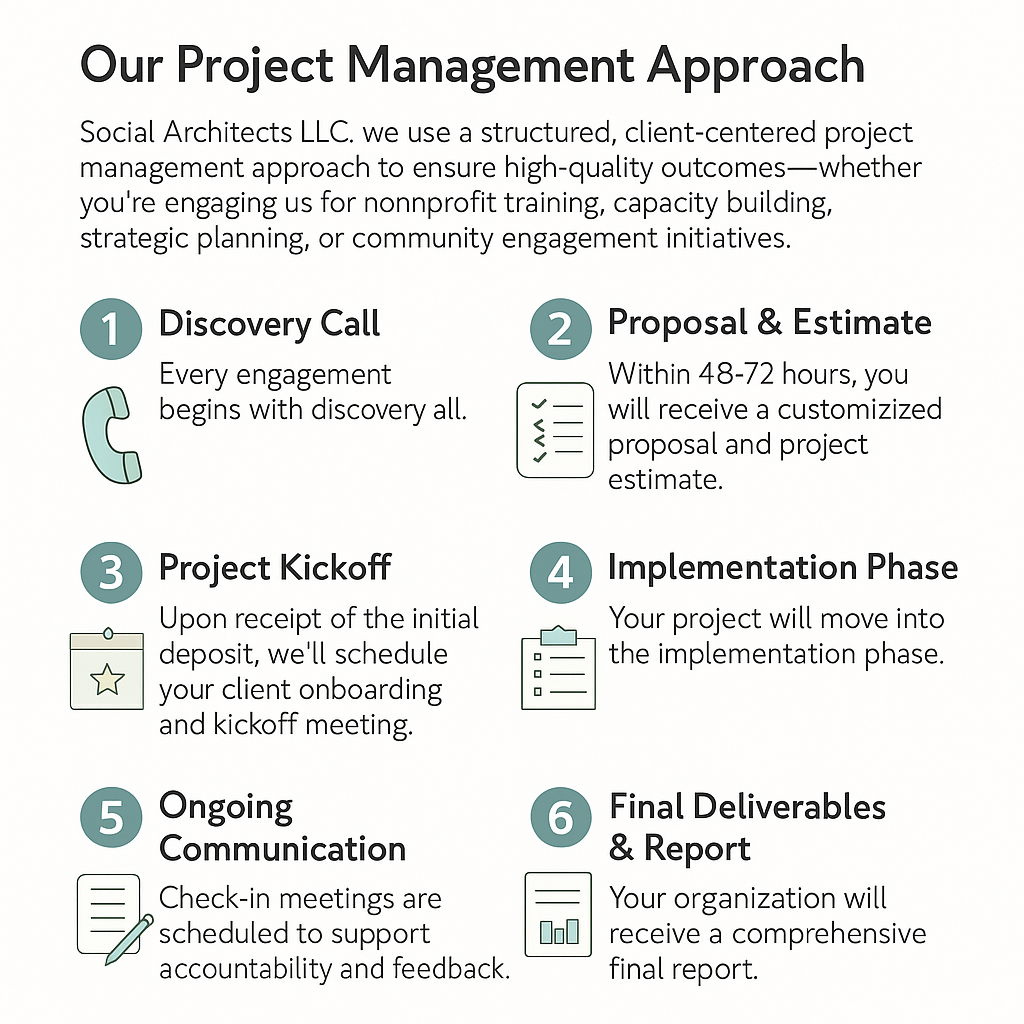 At Social Architects LLC, we use a structured, client-centered project management approach to ensure high-quality outcomes across all our service offerings—whether you're engaging us for nonprofit training, capacity building, strategic planning, or community engagement initiatives.